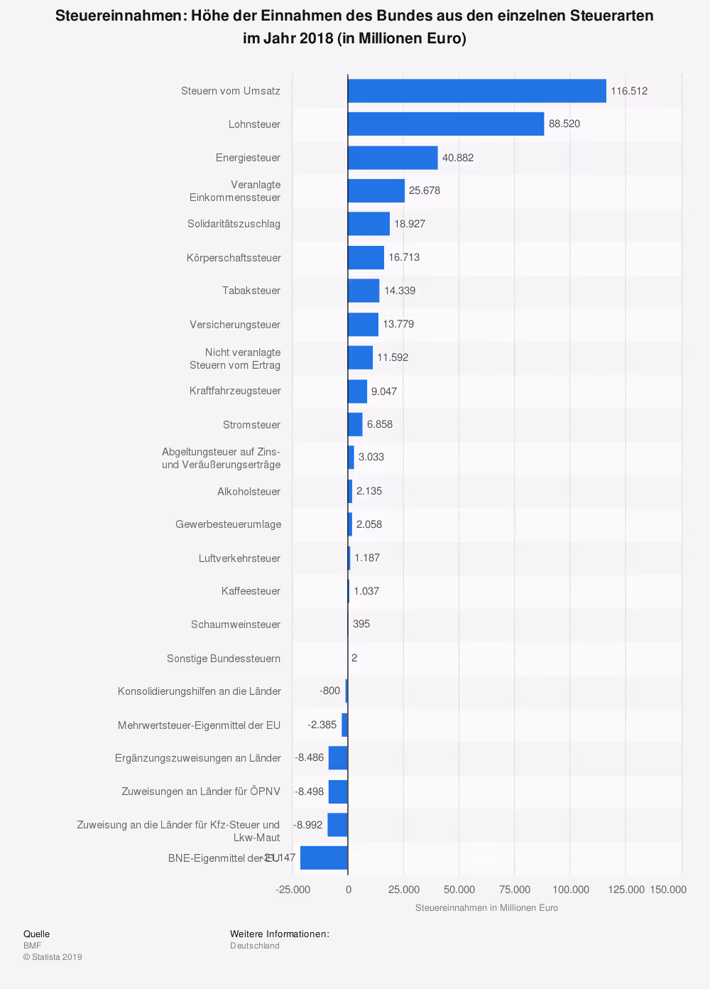 Interessanterweise sind die Umsatzsteuer und die Lohnsteuer die zwei grössten Steuereinnahmen und "brachten" in 2018 über 200 Milliarden EURO!