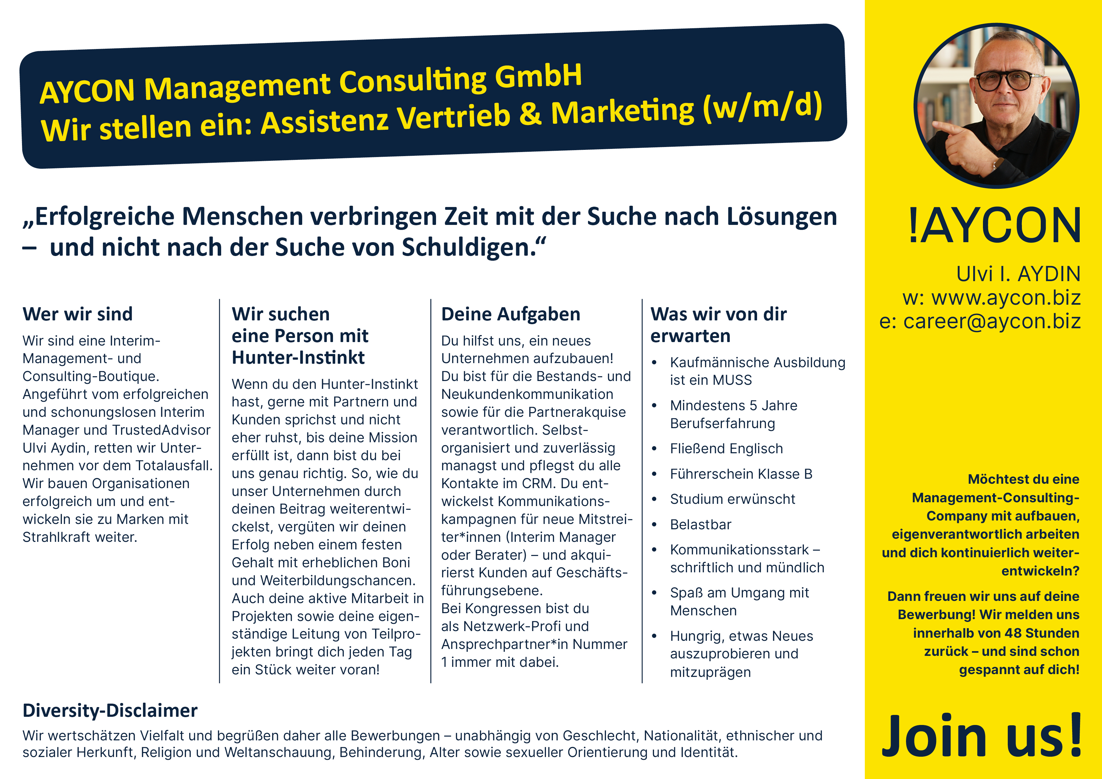 Wer wir sind Wir sind eine Interim-Management- und Consulting-Boutique.Angeführt vom erfolgreichen und schonungslosen Interim Manager und Trusted AdvisorUlvi Aydin, retten wir Unternehmen vor dem Totalausfall.Wir bauen Organisationen erfolgreich um und entwickeln sie zu Marken mit Strahlkraft weiter.‍Wir suchen eine Person mit Hunter-InstinktWenn du den Hunter-Instinkt hast, gerne mit Partnern und Kunden sprichst und nicht eher ruhst, bis deine Mission erfüllt ist, dann bist du bei uns genau richtig. So, wie du unser Unternehmen durch deinen Beitrag weiterentwi-ckelst, vergüten wir deinen Erfolg neben einem festen Gehalt mit erheblichen Boni und Weiterbildungschancen.Auch deine aktive Mitarbeit in Projekten sowie deine eigenständige Leitung von Teilpro-jekten bringt dich jeden Tag ein Stück weiter voran!‍Deine AufgabenDu hilfst uns, ein neues Unternehmen aufzubauen!Du hilfst uns, ein neues Unternehmen aufzubauen! Du bist für die Bestands-und Neukundenkommunikation sowie für die Partnerakquise verantwortlich.Selbstorganisiert und zuverlässig managst und pflegst du alle Kontakte imCRM. Du entwickelst Kommunikations-kampagnen für neue Mitstreiter*innen (Interim Manager oder Berater) - und akquirierst Kunden auf Geschäfts-führungsebene. Bei Kongressen bist du als Netzwerk-Profi und Ansprechpart-ner*in Nummer 1 immer mit dabei.‍Was wir von dir erwartenKaufmännische Ausbildung ist ein MUSS Mindestens 5 Jahre Berufserfahrung Fließend Englisch Führerschein Klasse B Studium erwünscht Belastbar Kommunikationsstark - schriftlich und mündlich Spaß am Umgang mit Menschen Hungrig, etwas Neues auszuprobieren und mitzuprägen‍Diversity-DisclaimerWir wertschätzen Vielfalt und begrüßen daher alle Bewerbungen - unabhängig von Geschlecht, Nationalität, ethnischer und sozialer Herkunft, Religion und Weltanschauung, Behinderung, Alter sowie sexueller Orientierung und Identität.